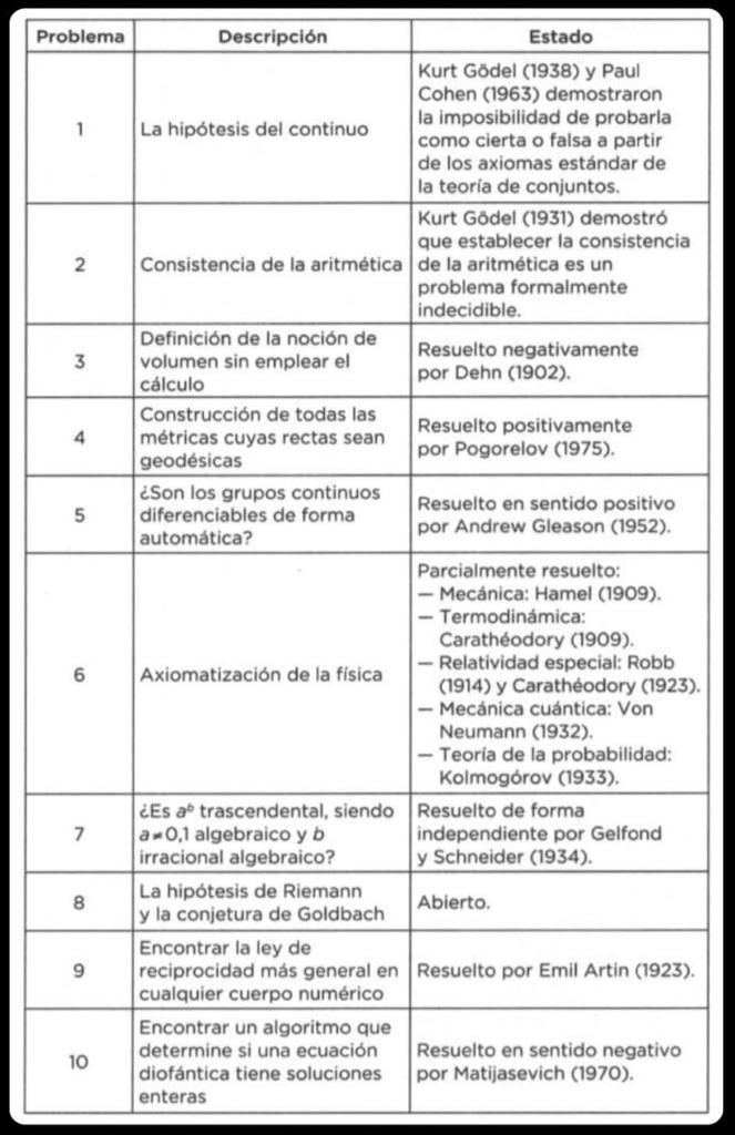 En 1900, otro gran matemático, David Hilbert, enumeró los 23 problemas de matemáticas más importantes para el siglo XX y el primero de la lista fue precisamente ¡ La hipótesis del continuo !