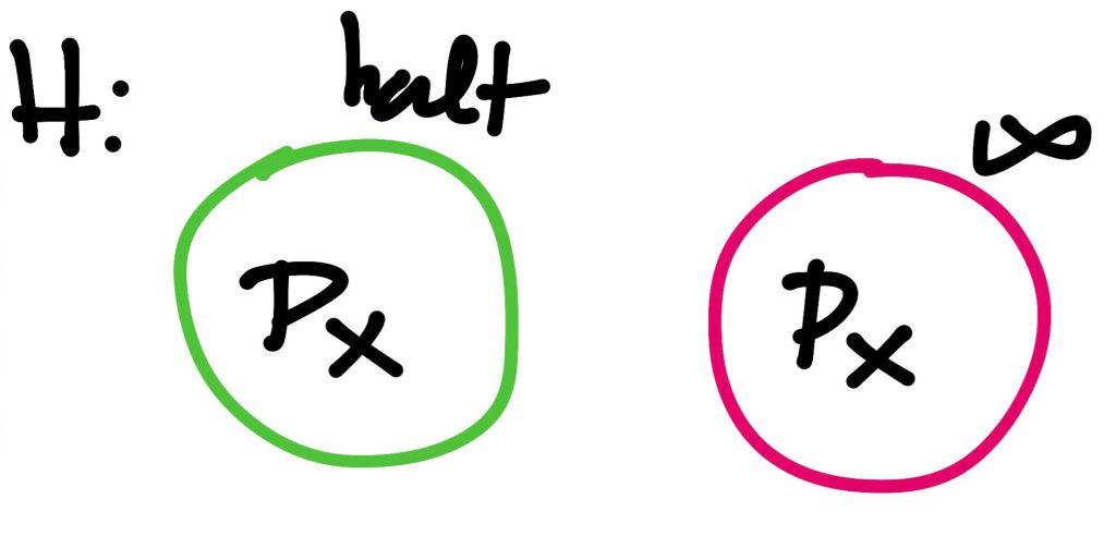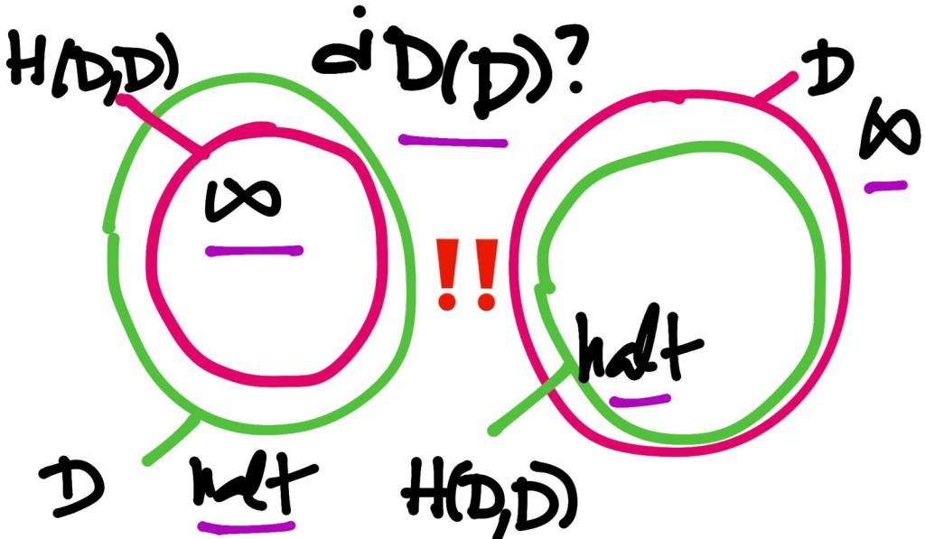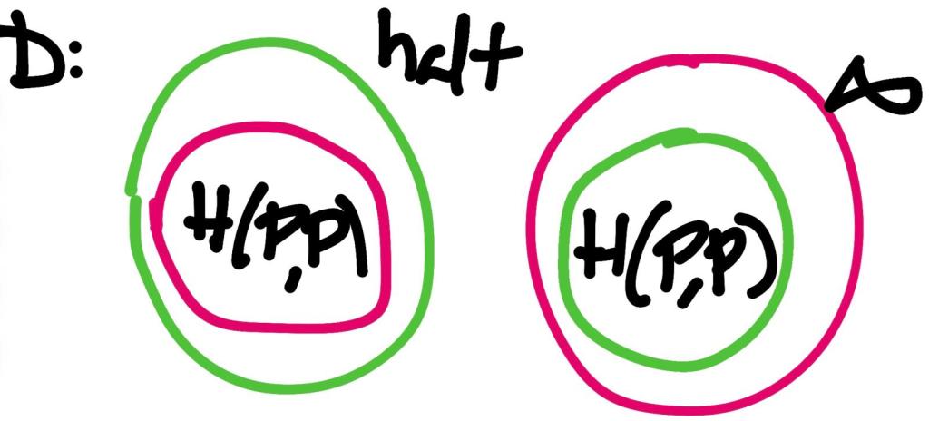 Y al contrario, si P con P se detiene, H se detiene, luego círculo verde, y bajo esta condición D entra en bucle infinito, círculo rojo.